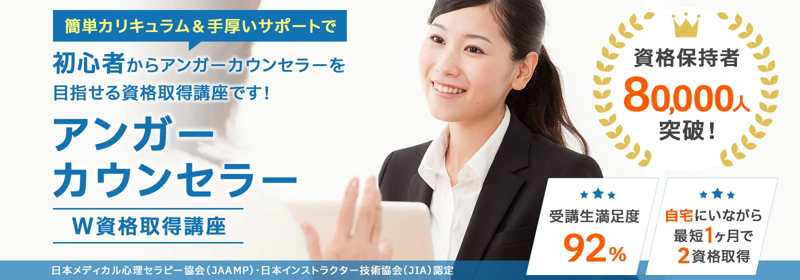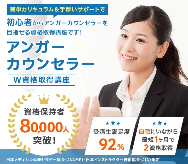 諒(りょう)設計アーキテクトラーニングのスペシャル講座なら、「アンガーカウンセラー®」と「アンガーコントロール士」の2資格を家にいながら、オンライン講座なら1ヶ月、紙教材なら2ヶ月で課題を提出するだけで100%資格取得できます。