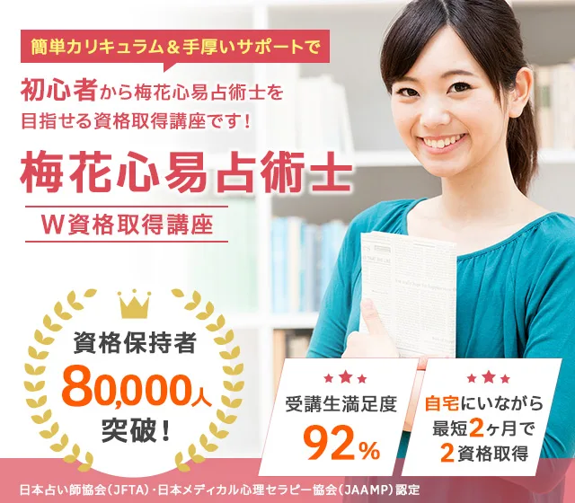 諒(りょう)設計アーキテクトラーニングのスペシャル講座なら、「梅花心易占術士®」と「梅花心易アドバイザー®」の2資格を家にいながら、オンライン講座なら1ヶ月、紙教材なら2ヶ月で課題を提出するだけで100%資格取得できます。