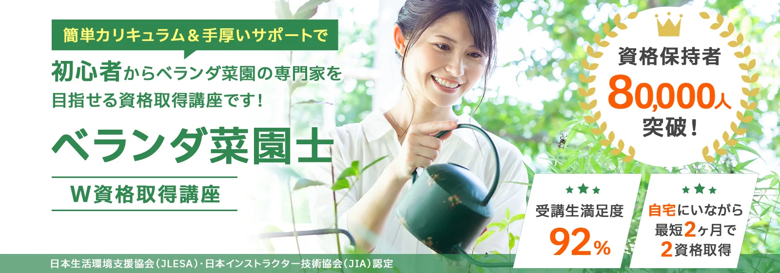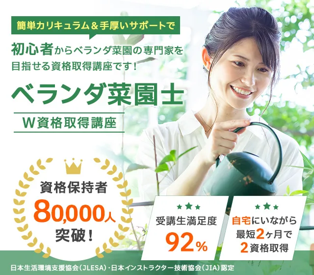 諒(りょう)設計アーキテクトラーニングのスペシャル講座なら、「ベランダ菜園士®」と「家庭菜園士®」の2資格を家にいながら、オンライン講座なら1ヶ月、紙教材なら2ヶ月で課題を提出するだけで100%資格取得できます。