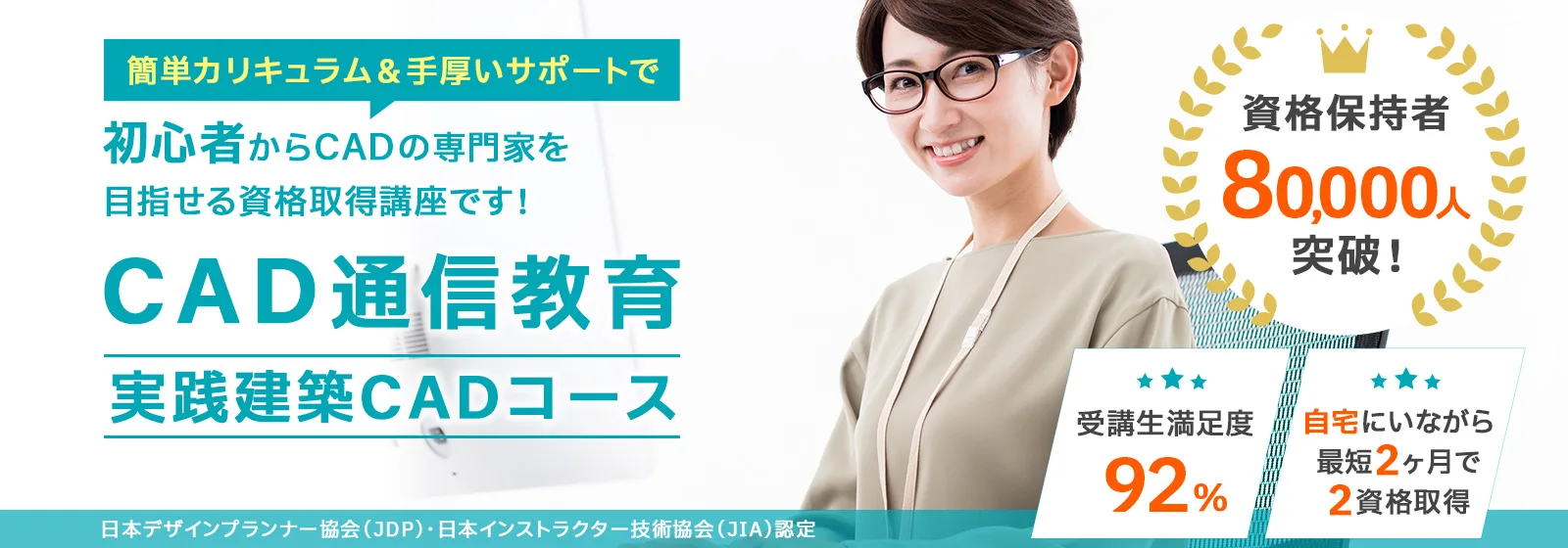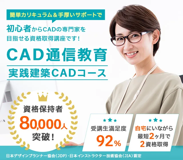 受講期間 6ヶ月(最短1ヶ月) 添削 5回 + 卒業課題1回 教材 ・ガイドブック・受講証・CADトレーニングガイド(AutoCADまたはJw_cad)・学習テキスト01・学習テキスト02・練習問題/解答・模擬試験/解答・添削課題(5回分)・卒業課題(添削終了後提出で資格認定)