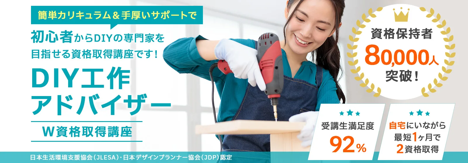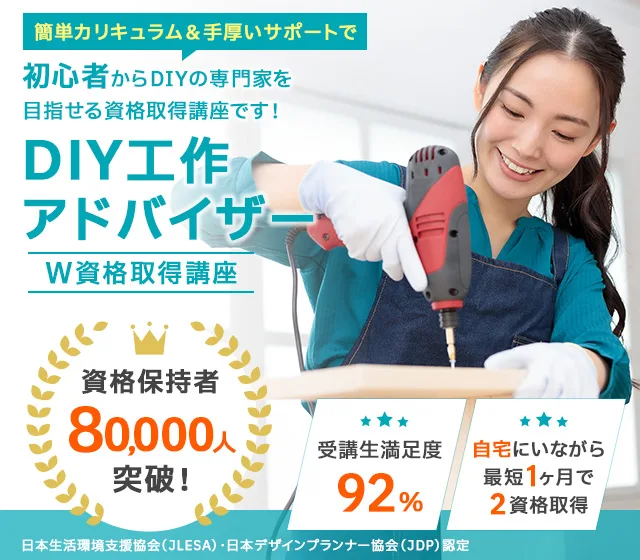 諒(りょう)設計アーキテクトラーニングのスペシャル講座なら、「DIY工作アドバイザー®」と「日曜大工士®」の2資格を家にいながら、オンライン講座なら1ヶ月、紙教材なら2ヶ月で課題を提出するだけで100%資格取得できます。