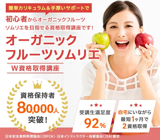 諒(りょう)設計アーキテクトラーニングのスペシャル講座なら、「オーガニックフルーツソムリエ」と「果物インストラクター」の2資格を家にいながら、オンライン講座なら1ヶ月、紙教材なら2ヶ月で課題を提出するだけで100%資格取得できます。