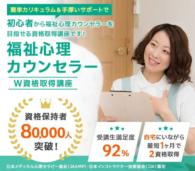 課題を全てクリアし、コースを卒業すると試験免除となり、「福祉心理カウンセラー」「福祉心理アドバイザー」の2資格が講座卒業と同時に取得できます。