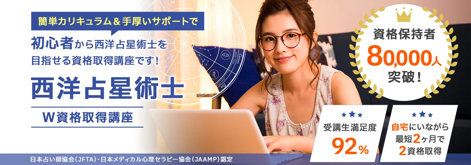諒(りょう)設計アーキテクトラーニングのスペシャル講座なら、「西洋占星術士」と「ホロスコープ鑑定士」の2資格を家にいながら、オンライン講座なら1ヶ月、紙教材なら2ヶ月で課題を提出するだけで100%資格取得できます。