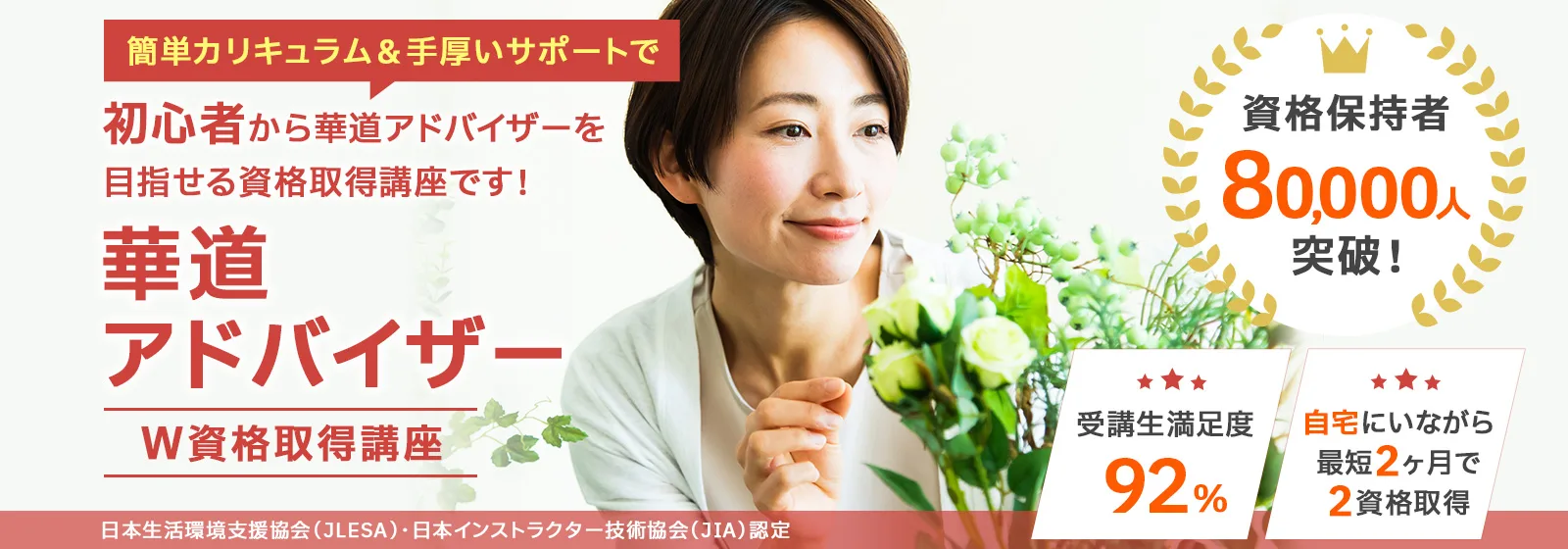 諒(りょう)設計アーキテクトラーニングのスペシャル講座なら、「華道アドバイザー®」と「花の活け方インストラクター」の2資格を家にいながら、オンライン講座なら1ヶ月、紙教材なら2ヶ月で課題を提出するだけで100%資格取得できます。