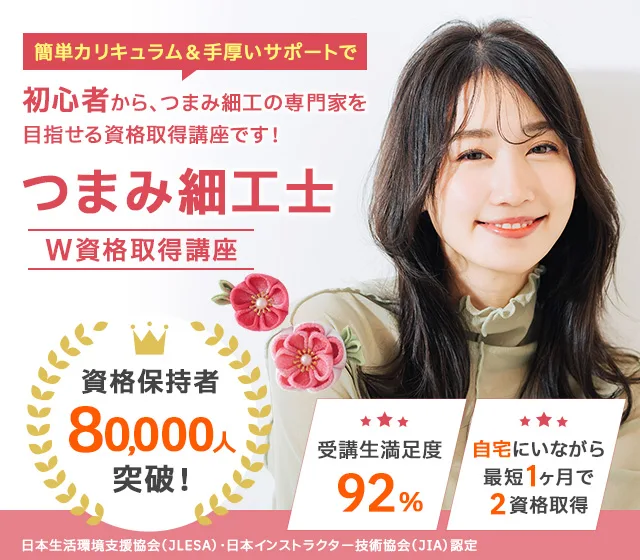自宅で学びたい方には、効率よく学習できるつまみ細工資格通信がおすすめです。自分のペースで基礎から応用まで学べるため、初心者でも安心して挑戦できます。