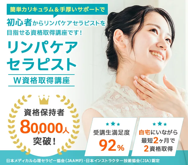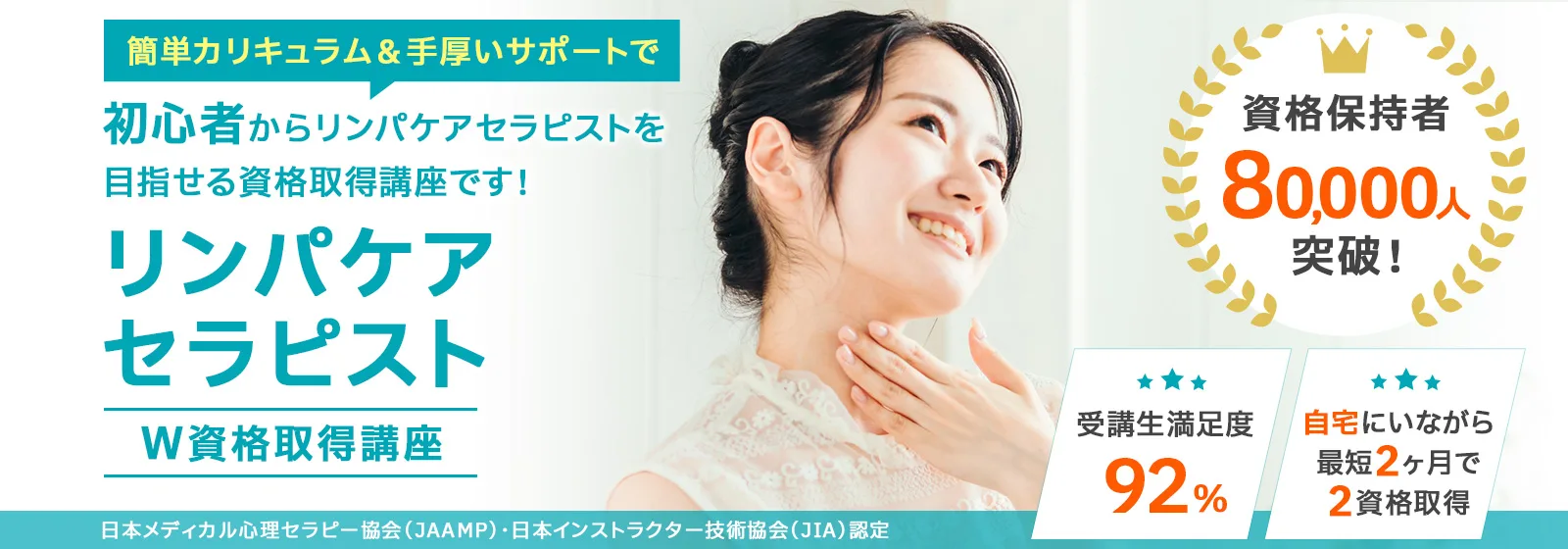 諒(りょう)設計アーキテクトラーニングのスペシャル講座なら、「リンパケアセラピスト」と「むくみ改善インストラクター」の2資格を家にいながら、オンライン講座なら1ヶ月、紙教材なら2ヶ月で課題を提出するだけで100%資格取得できます。