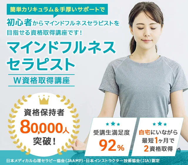 諒(りょう)設計アーキテクトラーニングのスペシャル講座なら、「マインドフルネスセラピスト」と「瞑想インストラクター」の2資格を家にいながら、オンライン講座なら1ヶ月、紙教材なら2ヶ月で課題を提出するだけで100%資格取得できます。