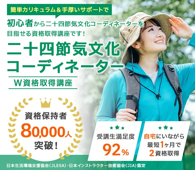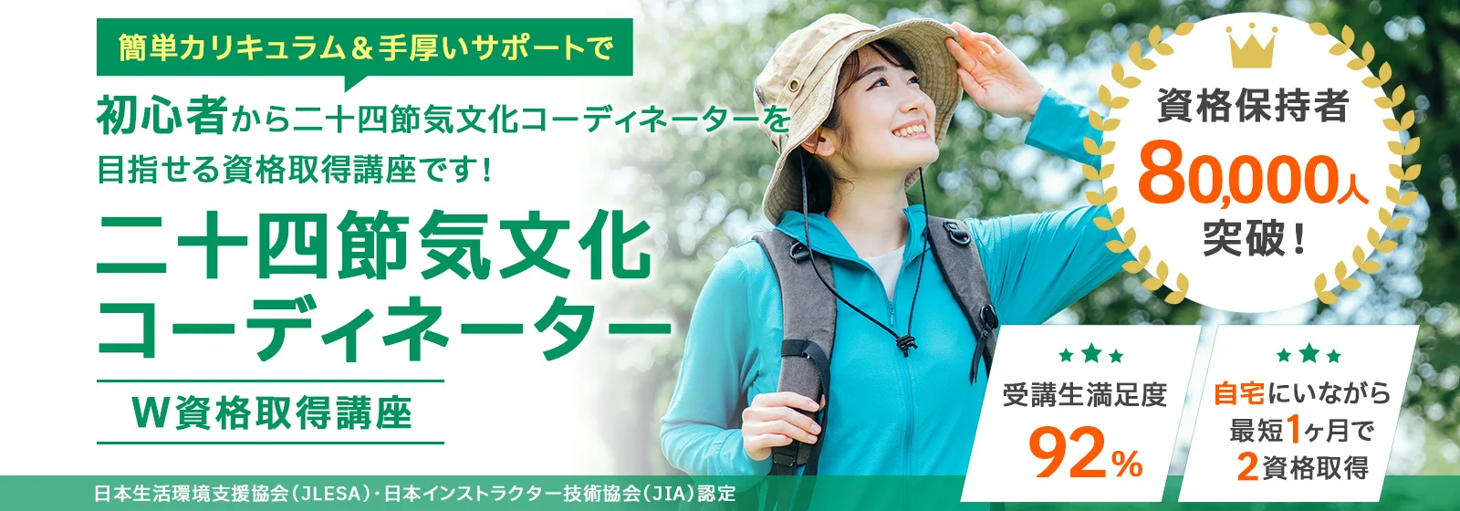 諒(りょう)設計アーキテクトラーニングのスペシャル講座なら、「二十四節気文化コーディネーター®」と「四季ソムリエ®」の2資格を家にいながら、オンライン講座なら1ヶ月で課題を提出するだけで100%資格取得できます。