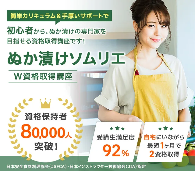 ぬか漬け資格を取得することで、家庭の食卓に健康とおいしさを届けるだけでなく、発酵食の専門家として活躍する第一歩を踏み出すことができます。健康食や伝統食文化に興味のある方に、特におすすめの資格です。