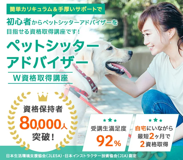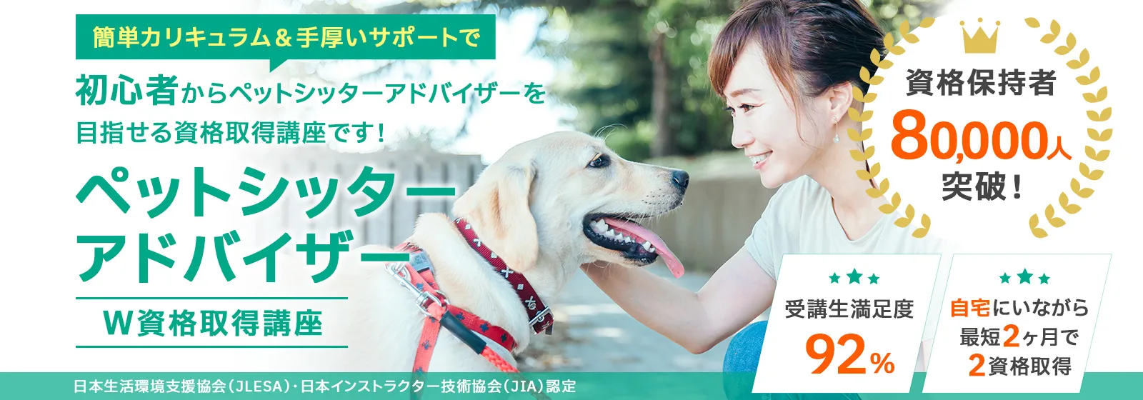 諒(りょう)設計アーキテクトラーニングのスペシャル講座なら、「ペットシッターアドバイザー®」と「ペットホテルソムリエ®」の2資格を家にいながら、オンライン講座なら1ヶ月、紙教材なら2ヶ月で課題を提出するだけで100%資格取得できます。
