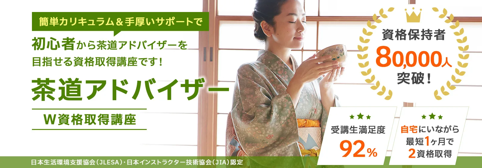 諒(りょう)設計アーキテクトラーニングのスペシャル講座なら、「茶道アドバイザー」と「お点前インストラクター」の2資格を家にいながら、オンライン講座なら1ヶ月、紙教材なら2ヶ月で課題を提出するだけで100%資格取得できます。