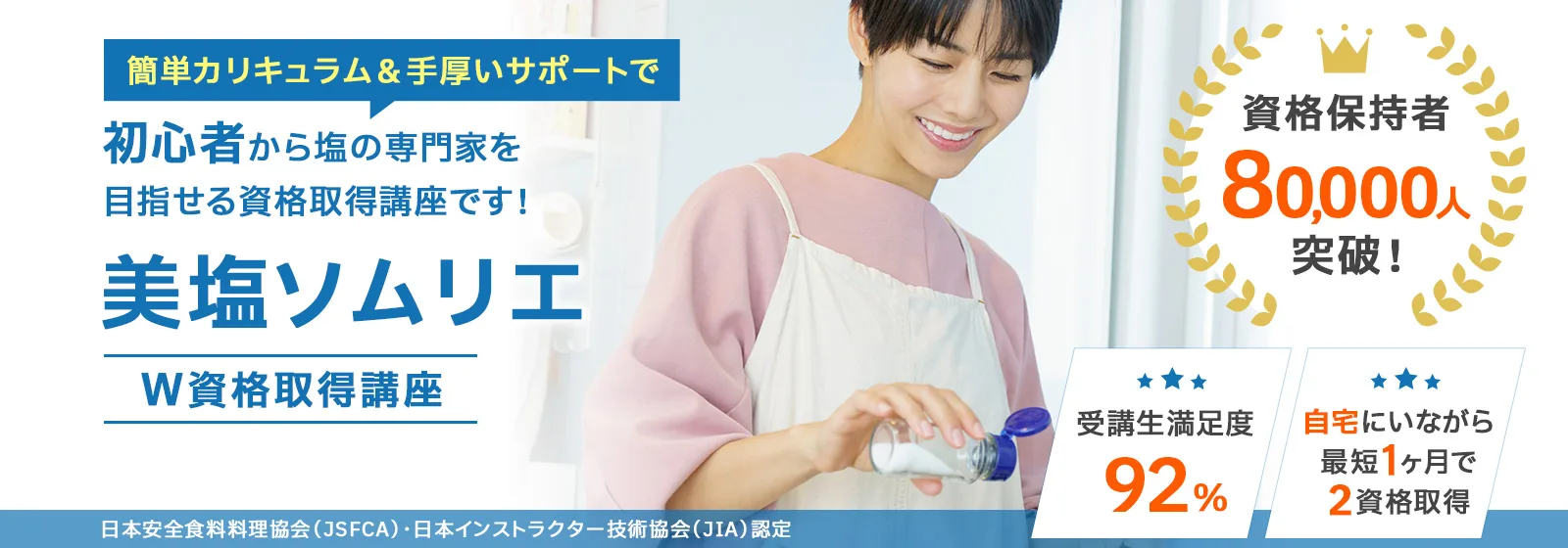 諒(りょう)設計アーキテクトラーニングのスペシャル講座なら、「美塩ソムリエ」と「食塩アドバイザー」の2資格を家にいながら、オンライン講座なら1ヶ月で課題を提出するだけで100%資格取得できます。