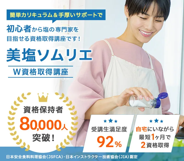 中でも人気なのが、美塩ソムリエ資格、塩ソムリエ資格です。料理人やフードコーディネーター、栄養士をはじめ、一般の主婦や食への関心が高い方にも人気の資格で、塩の種類ごとの特徴や健康効果、減塩調理の方法など、実生活に直結する知識を身につけられます。