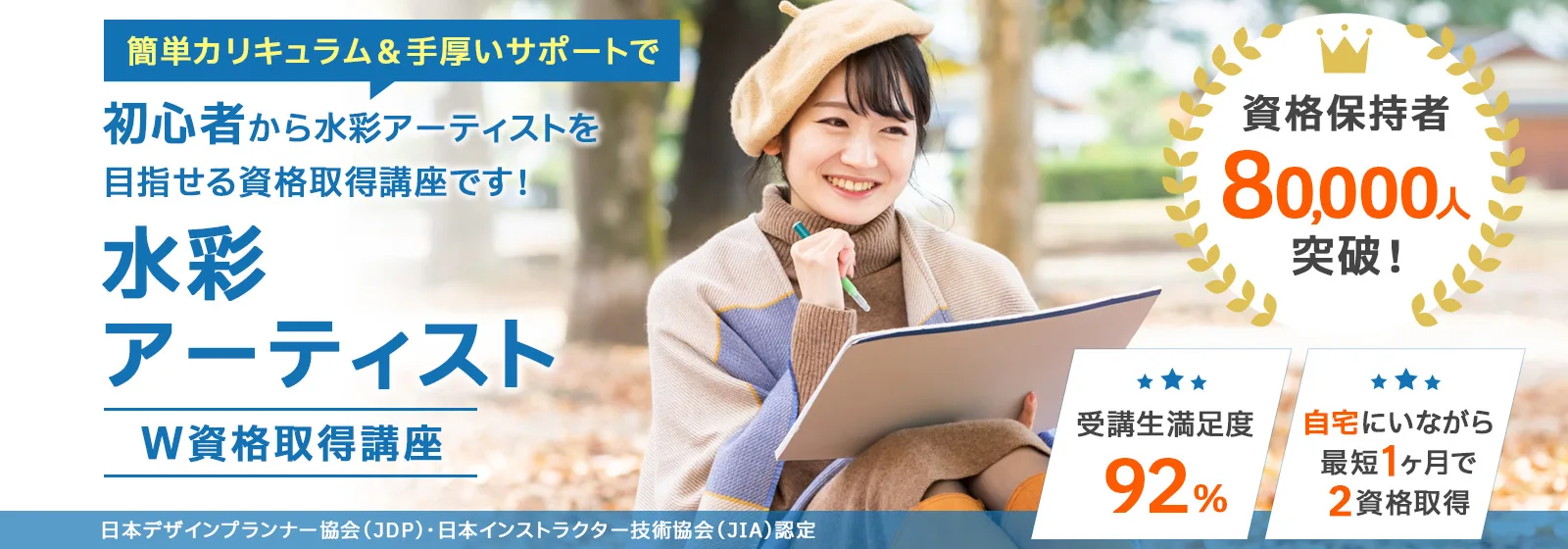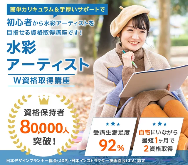諒(りょう)設計アーキテクトラーニングのスペシャル講座なら、「水彩アーティスト®」と「水彩画インストラクター」の2資格を家にいながら、オンライン講座なら1ヶ月で課題を提出するだけで100%資格取得できます。