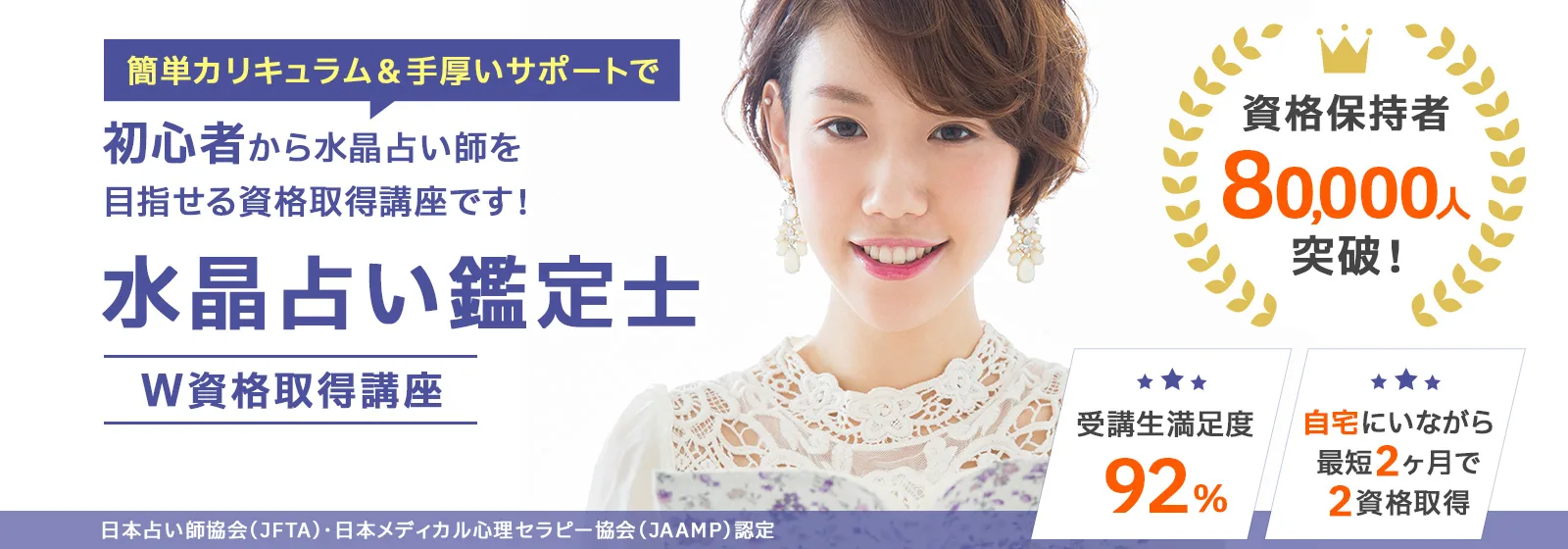 諒(りょう)設計アーキテクトラーニングのスペシャル講座なら、「水晶占い鑑定士®」と「水晶占いアドバイザー」の2資格を家にいながら、オンライン講座なら1ヶ月、紙教材なら2ヶ月で課題を提出するだけで100%資格取得できます。