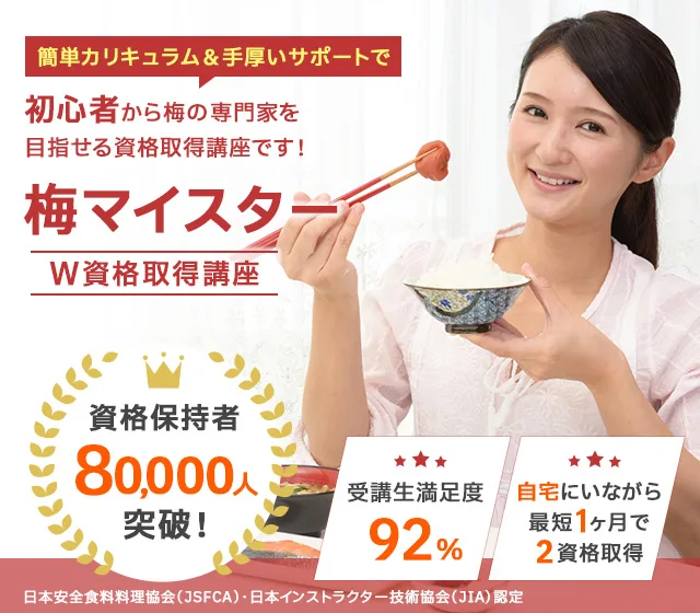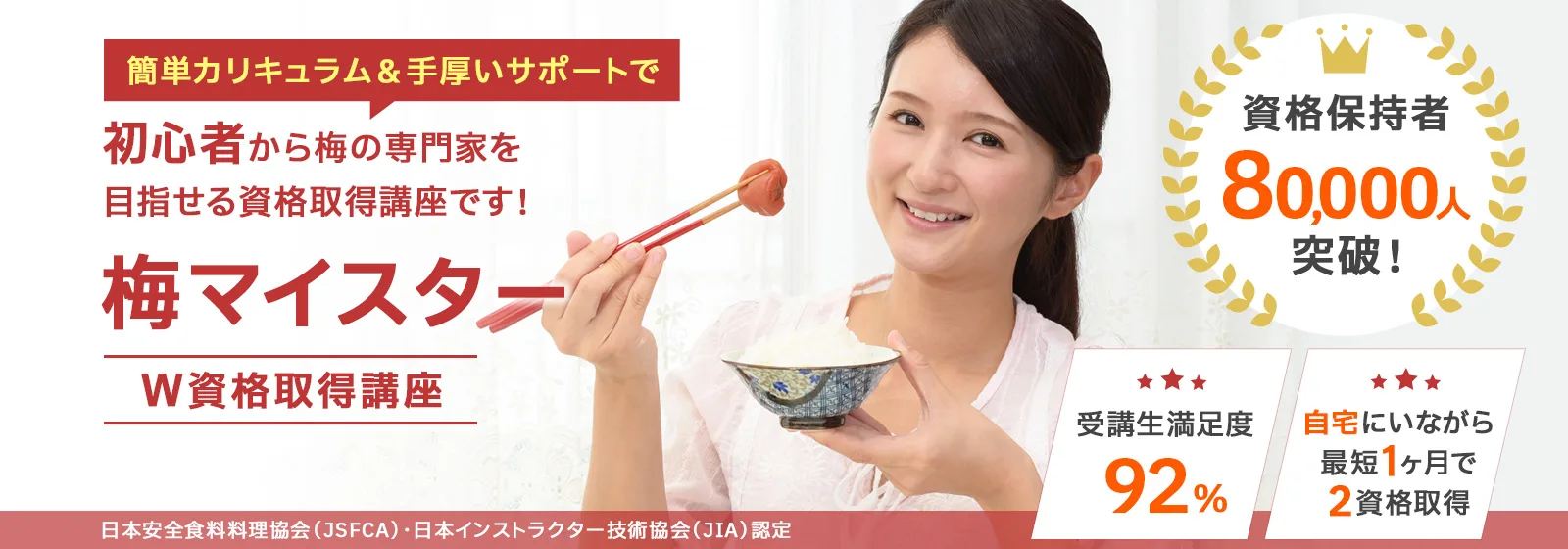 諒(りょう)設計アーキテクトラーニングのスペシャル講座なら、「梅マイスター」と「梅干しソムリエ」の2資格を家にいながら、オンライン講座なら1ヶ月で課題を提出するだけで100%資格取得できます。