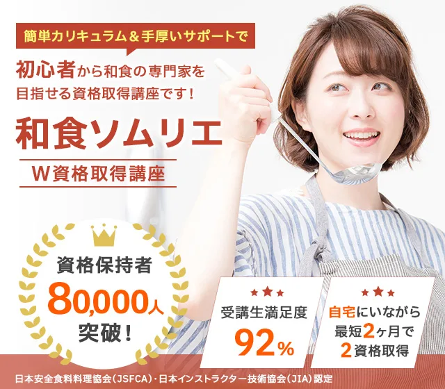 諒(りょう)設計アーキテクトラーニングのスペシャル講座なら、「和食ソムリエ®」と「日本料理ソムリエ®」の2資格を家にいながら、オンライン講座なら1ヶ月、紙教材なら2ヶ月で課題を提出するだけで100%資格取得できます。